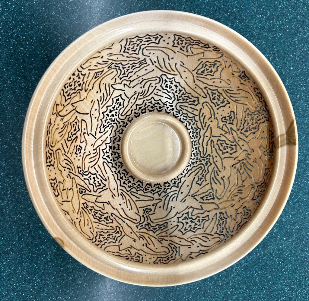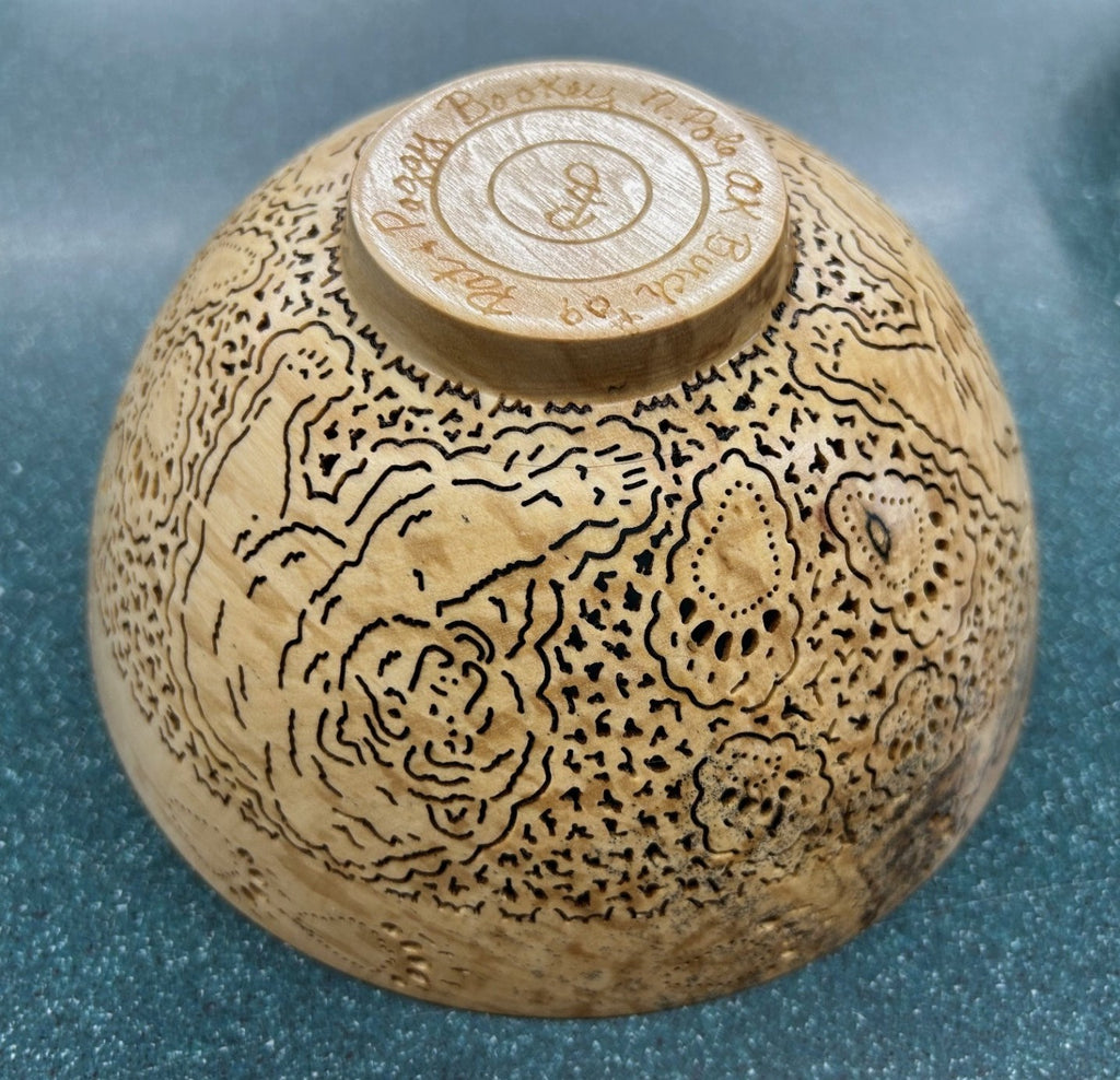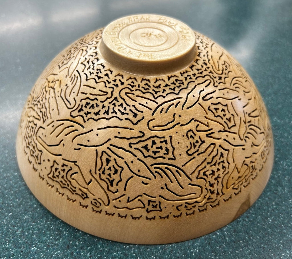 Then Peggy takes over and begins the intricate, painstaking process of cutting out minute pieces from the bowl to form a lace-like pattern Alaskan imagery. She uses dental tools to carve as they have the least vibration.