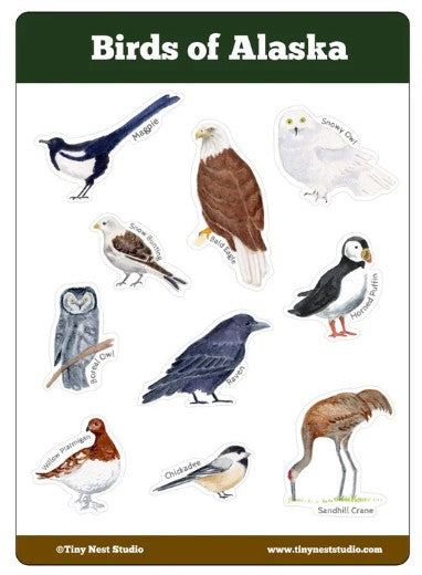 Birds of Alaska - Celebrate the wild beauty of Alaska’s birds year-round. This sticker sheet features a variety of iconic bird species seen across Alaska’s diverse landscapes. From songbirds to seabirds, each watercolor image is hand illustrated with care and character.