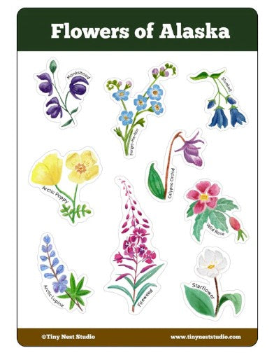 Flowers of Alaska - Celebrate the colorful charm of Alaska’s wildflowers year-round. This sticker sheet features a vibrant collection of blooms found across Alaska’s diverse landscapes. From alpine meadows to coastal trails, each watercolor image is hand illustrated.